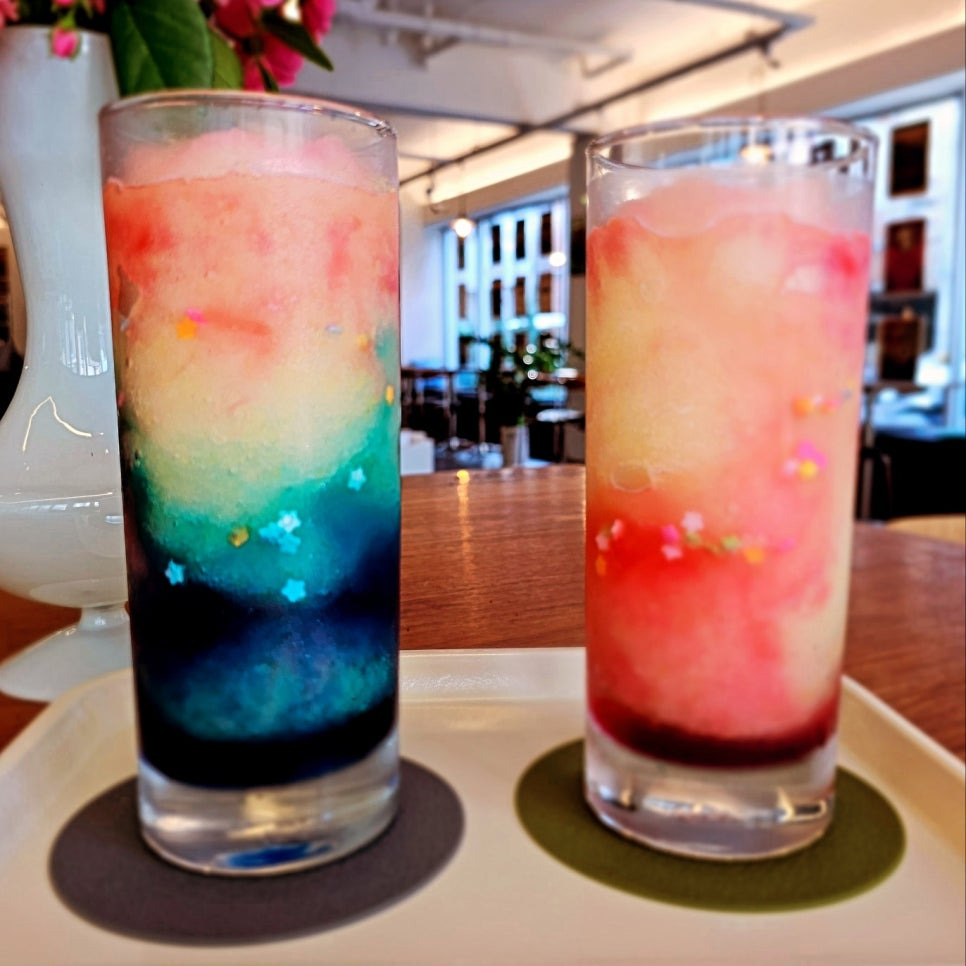 우주걘역시는 안토시아닌 성분이 들어 있는 시럽을 넣어 산염기 반으에 따라 색상이 급변하는 스무디인데, 우주 관측에서 관찰 할 수 있는 성운에서 영감을 받았다고 합니다.